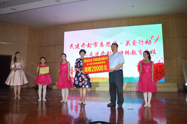 5月18日上午,在第28个全国助残日即将到来之际,民建开封市委“思源·关爱行动”走进开封市特殊教育学校,为特殊儿童送上温暖和祝福。民建会员、河南省新龙置业有限公司总经理朱明杰为开封市特殊教育学校捐款2万元现金。民建开封市委主委高晓阳,副主委管继平,秘书长王强,河南省新龙置业有限公司代表参加活动。