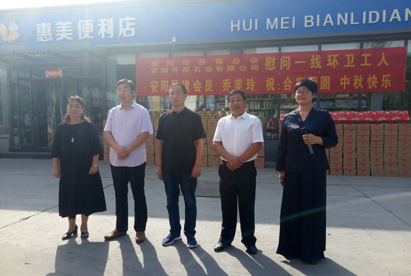 浓浓民建情,中秋暖民心 。9月21日,在中国传统节日中秋佳节到来之际,安阳民建会员、开祥石油有限公司总经理乔美玲慰问殷都区环卫工人,赠送价值四万余元的月饼和食用油,向他们送去中秋的祝福。民建安阳市委副主委武国斌,第六支部主委王守琴参加活动。