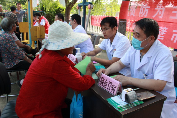 上午9:30,在纸坊村健身广场上,医生们对村民进行血压测量、血型检测、心电图检查,对来问诊的村民进行详细诊断。医生们耐心细致的诊断和医者仁心的大爱让村民感受到了党和政府的关怀。现场,医生蹲下查看患者肿胀的脚踝,细心写下村民所问问题的诊断及治疗办法。民建鹤壁市委山城区支部主委、市人民医院神经内科主任李东晓连续为30多名村民问诊。