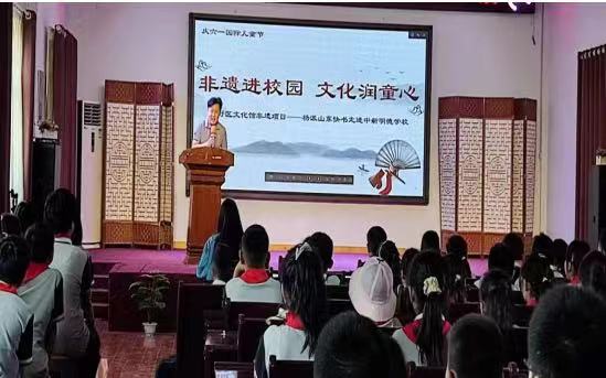 为传承与弘扬优秀传统文化,营造和谐向上、文明健康的校园文化氛围,培养小学生的核心素养,提高学生的综合素养,5月25日,在端午节和“六一”国际儿童节来临之际,民建新乡市委会新知支部主委、杨派山东快书传承人马帅应牧野区文化馆邀请到中新明德学???ldquo;非遗进校园.文化润童心”杨派山东快书公益讲座活动,为全校师生献上了一场精彩的优秀传统文化盛宴。