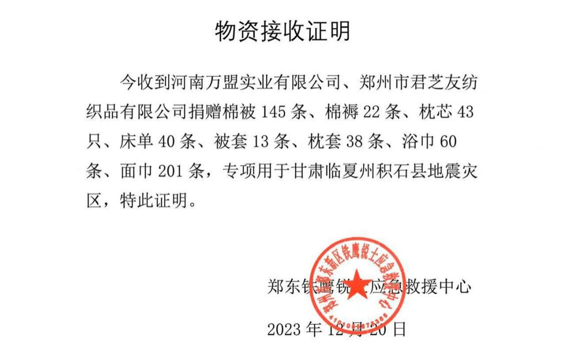 郑州君芝友纺织品有限公司在做好企业的同时,始终不忘回馈社会,主动承担社会责任、积极开展公益事业,连续多年参与爱心捐款捐物,被管城区慈善总会评为“慈善事业最具爱心捐赠企业”。顾陆军表示,公司将持续关注震区灾情,为受灾地区早日恢复正常生产生活尽绵薄之力。