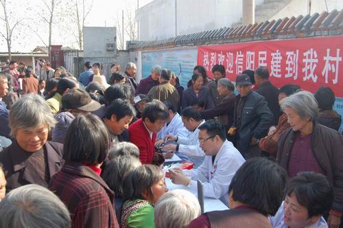 上午九点多前来咨询,就诊的近千名村民早早等在村口,欢迎专家们到来。在村委会大院里义诊队伍一字摆开,市中心医院、市第三医院、市肿瘤医院的多名专家热情认真的帮助村民测量血压,检查身体,解释病因,接受咨询,提出治疗方案,得到了广大村民的好评。
