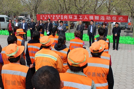 4月1日,由民建许昌市委主办的“统一战线向环卫工人爱心捐赠”活动在许昌火车站广场举行,市委常委、统战部部长刘保新,市政协副主席、民建许昌市委主委张巍巍等参加了活动。许昌市手外科医院院长温淑贤,许昌老胡家餐饮公司董事长胡保安应邀出席捐赠活动,并向全市1500余名环卫工人赠送价值45万的医院32项免费体检卡、价值7.25万老胡家荆芥酱等慰问品。