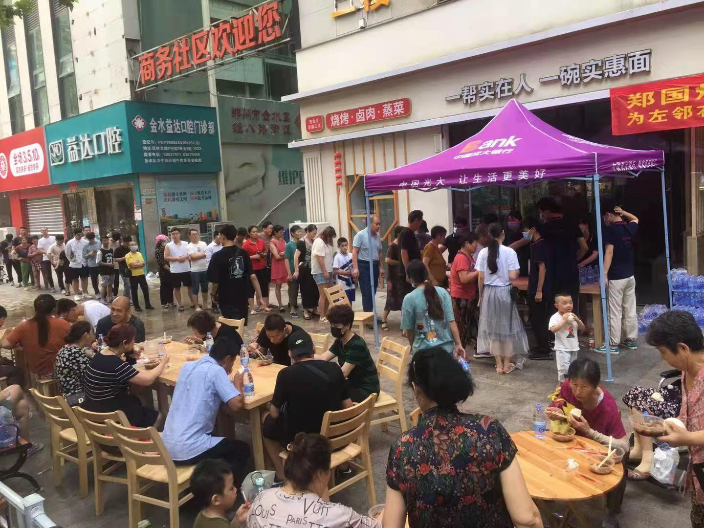 7月21日早上不到6点,冯献辉便淌水过几条漫过大腿的街道,急急忙忙赶到饭店开始和员工们着手准备当天的免费爱心餐食。中午12点整,经过饭店所有员工的努力下,郑国烩面和海子烧烤店在店门前支起的大棚前开始为左邻右舍和过往市民发放爱心餐饮,同时在门前和店内均提供了桌椅板凳。附近受汛情影响无法做饭的居民在店门前领取餐食之后,或带回家中食用或就在店里店外的座位上直接用餐。