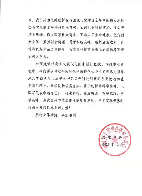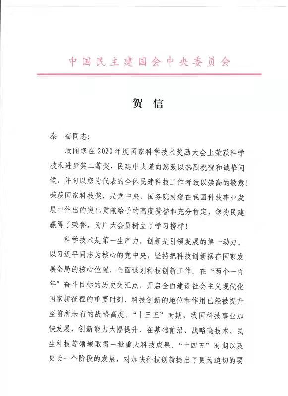 民建中央致国家科技进步二等奖获得者秦奋的贺信