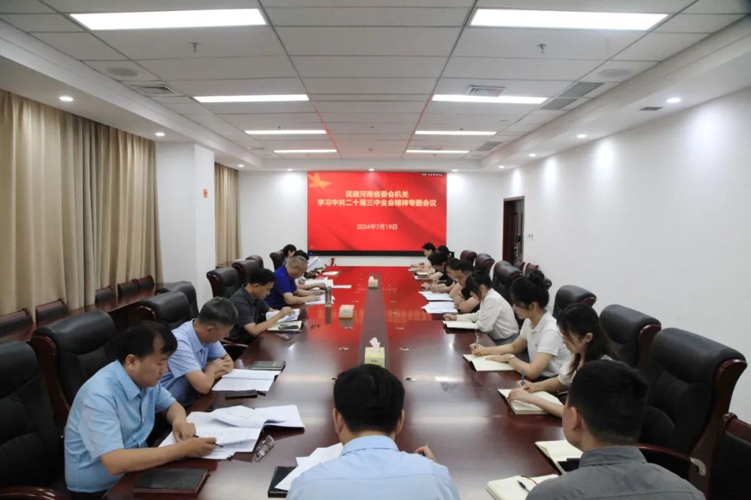 7月19日,民建河南省委会机关召开学习中共二十届三中全会精神专题会议。全国人大代表、民建河南省委会主委梁留科主持会议并讲话。全国政协委员、民建河南省委会专职副主委杨士海传达《中国共产党第二十届中央委员会第三次全体会议公报》。民建河南省委会二级巡视员李峰及机关全体干部参加学习。